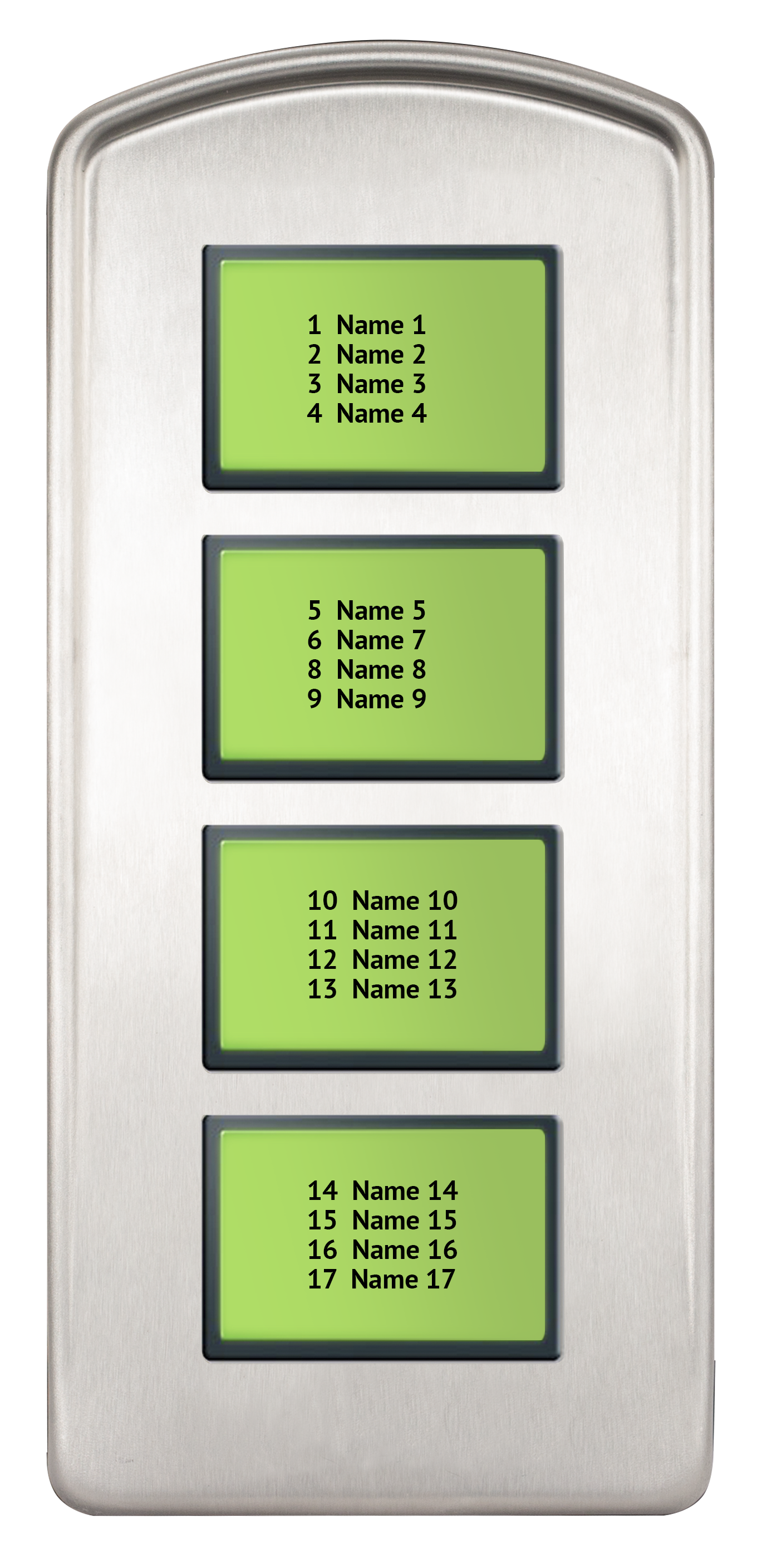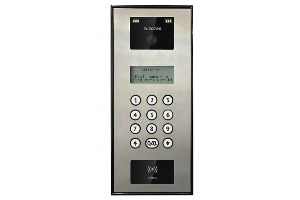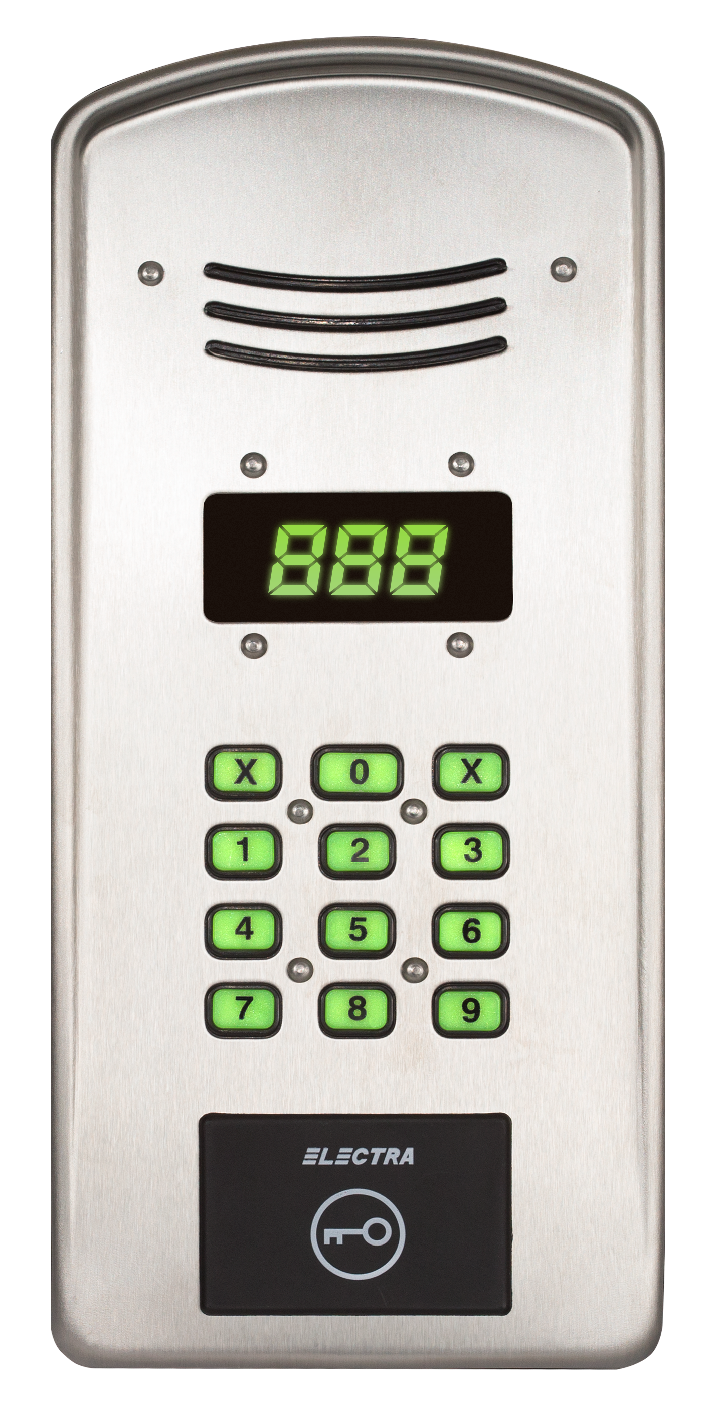 Carcasă din INOX, display electronic pentru listă locatari și afișare status utilizare, tastatură clasică iluminată, acces cu card RFID.